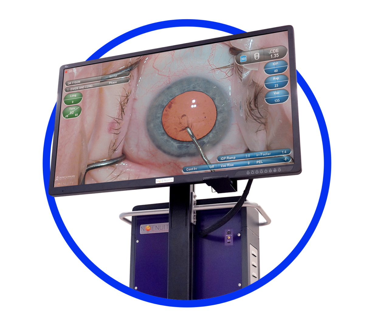 • Контроль внутрішньоочного тиску (IOP) – система автоматично підтримує стабільний тиск всередині ока під час операції, що критично важливо для безпеки пацієнта.